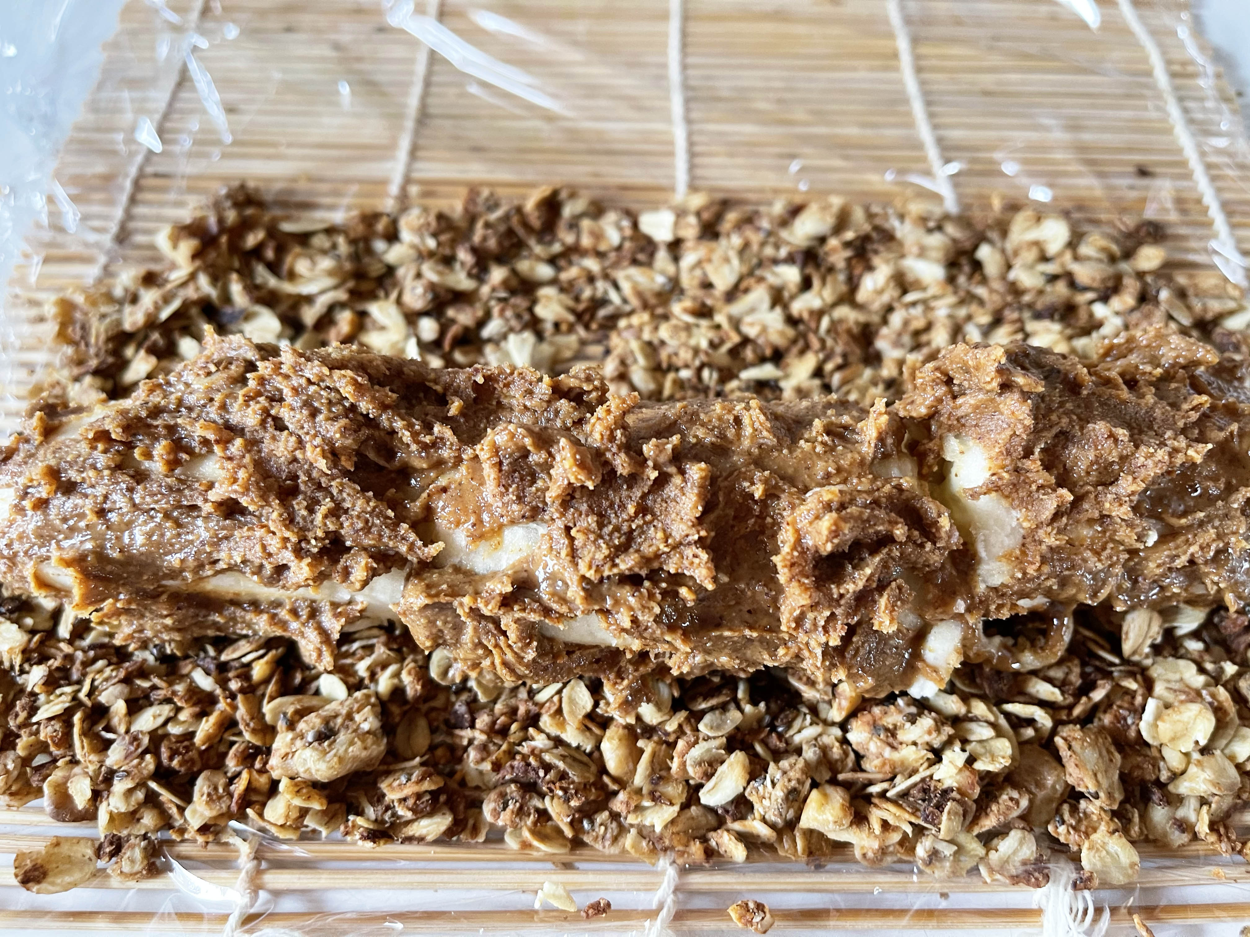 Ze všeho nejdříve si ve vodní lázni nebo v mikrovlnné troubě necháme rozměknout mandlové máslo (pokud nemáte madlové, můžete vyzkoušet i s jinými tipy ořechových másel). Na pracovní stůl si připravíme bambusovou podložku na sushi a na ni položíme fólii Fresh’n’Roll. Na 1/3 rozprostřeme tenkou vrstvu granoly. Banán nebo jahody namočíme do mandlového másla a položíme je na vrstvu granoly. A potom rolujeme, tak jako byste rolovali sushi. Rolku nezapomeňte pořádně utáhnout, aby se granola co nejlépe přilepila na mandlové máslo. Na chvíli necháme odpočinout v lednici a před servírováním nakrájíme na cca 3 cm hrubé kousky.